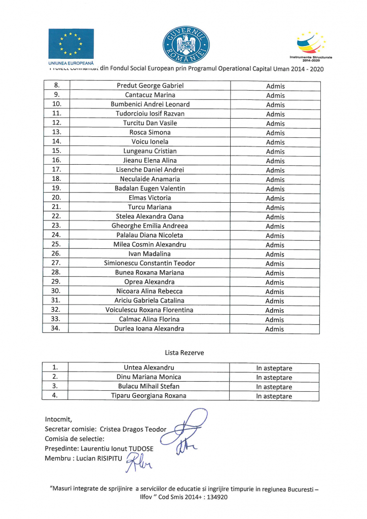 • PROCES-VERBAL FINAL de selecție a grupului țintă în cadrul proiectului ‘’Masuri integrate de sprijinire a serviciilor de educație și îngrijire timpurie în regiunea București – Ilfov „Primii Pași Spre Viitor” Cod SMIS 2014 + :134920 Creșa „Cerceluș” pentru anul școlar 2021-2022